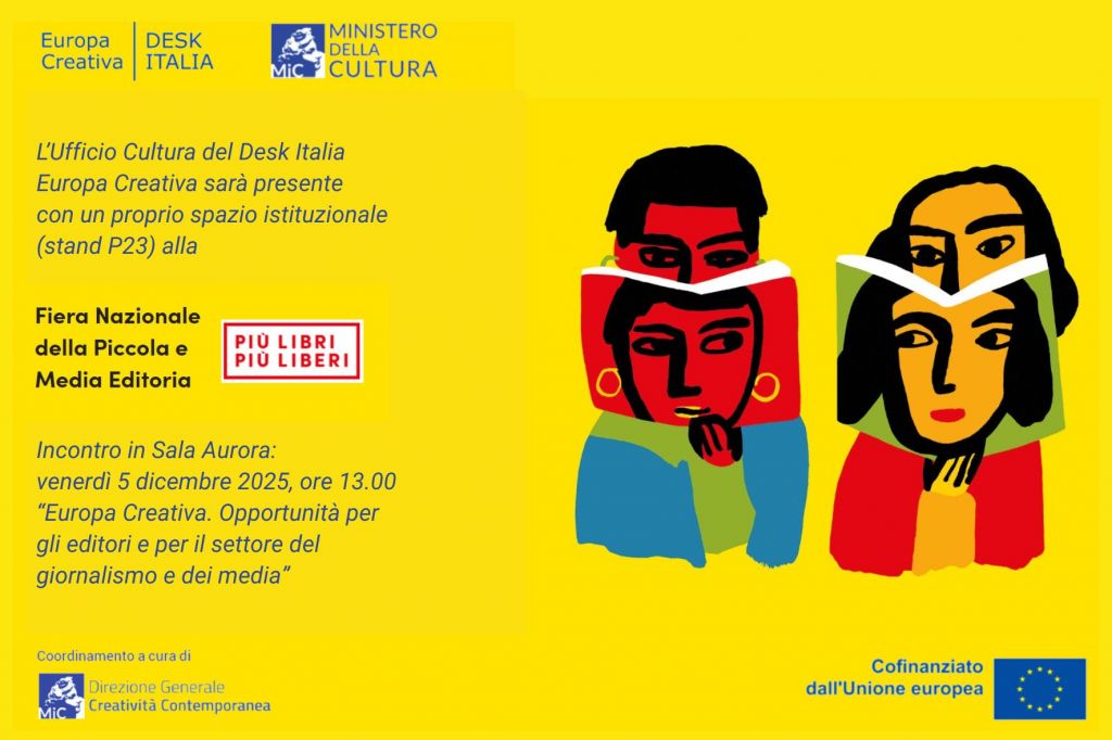 Presente con un proprio spazio istituzionale per rispondere alle domande sui bandi di Europa Creativa, per fornire assistenza tecnica e per presentare le ultime pubblicazioni. Venerdì 5 dicembre 2025 alle ore 13.00, in Sala Aurora, ci sarà una sessione informativa sui bandi di Europa Creativa dedicati alla traduzione letteraria, al giornalismo e ai progetti di alfabetizzazione all’utilizzo dei media.